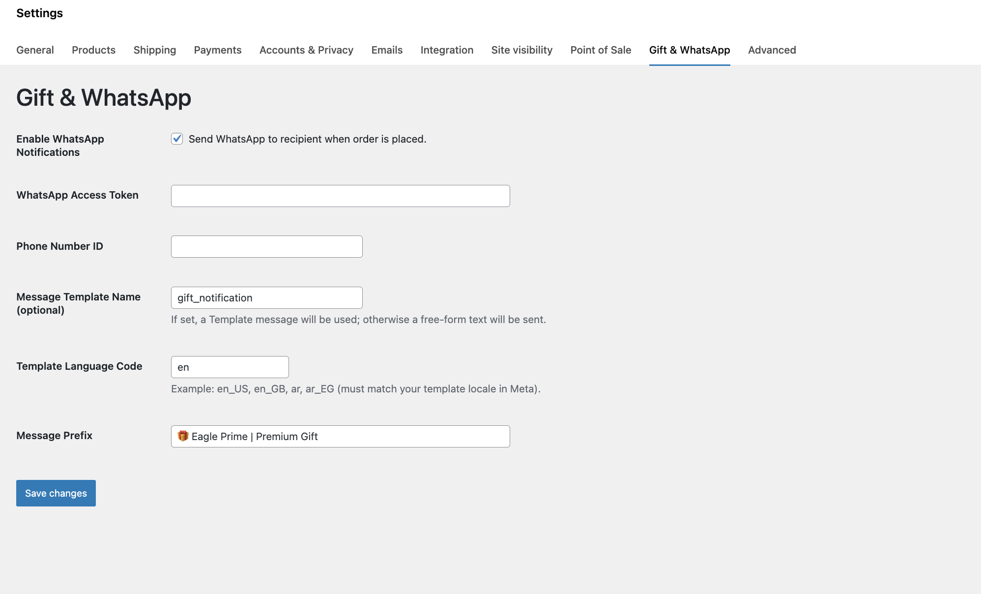 خلّي العميل يطلب المنتج كهدية — دفع أونلاين إلزامي، وحقول مستلم الهدية في الشيك-أوت، وإيميلات للطرفين، وتنبيه واتساب (اختياري عبر API).